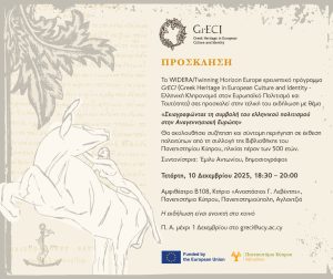 Το τριετές WIDERA/Twinning Horizon Europe ερευνητικό πρόγραμμα GrECI (Greek Heritage in European Culture and Identity), μια συνεργασία του Πανεπιστημίου Κύπρου, του Πανεπιστημίου του Όσλο και του Πανεπιστημίου Franche-Comté της Γαλλίας, ολοκληρώνεται και πραγματοποιεί την τελική του εκδήλωση την Τετάρτη, 10 Δεκεμβρίου 2025, 18:30–20:00, στο Αμφιθέατρο Β108 του Πανεπιστημίου Κύπρου, Πανεπιστημιούπολη, Αγλαντζιά, σε συνεργασία με τη Βιβλιοθήκη του Πανεπιστημίου Κύπρου.
