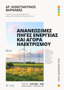 Το Διατμηματικό Πρόγραμμα της Πολυτεχνικής Σχολής «Ενεργειακές Τεχνολογίες και Αειφόρος Σχεδιασμός» (ΕΤΑΣ) σας προσκαλεί σε διάλεξη με θέμα τις «Ανανεώσιμες Πηγές Ενέργειας και Αγορά Ηλεκτρισμού» που θα πραγματοποιηθεί την Τετάρτη 22 Απριλίου 2026 και ώρα 18:00 – 19:00, στη αίθουσα 109 του κτιρίου ΧΩΔ 01 στην Πανεπιστημιούπολη, με ομιλητή τον Δρ. Κωνσταντίνο Βαρνάβα, Διευθυντή Λειτουργίας Αγοράς ΔΣΜΚ (Διαχειριστής Συστήματος Μεταφοράς Κύπρου).