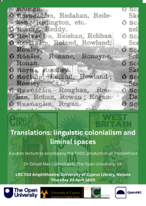 The UCY Irish Studies Collective of the Department of English Studies, in collaboration with the Open University, UK, warmly invite you to a public lecture to accompany the THOC production of Brian Friel’s Translations: